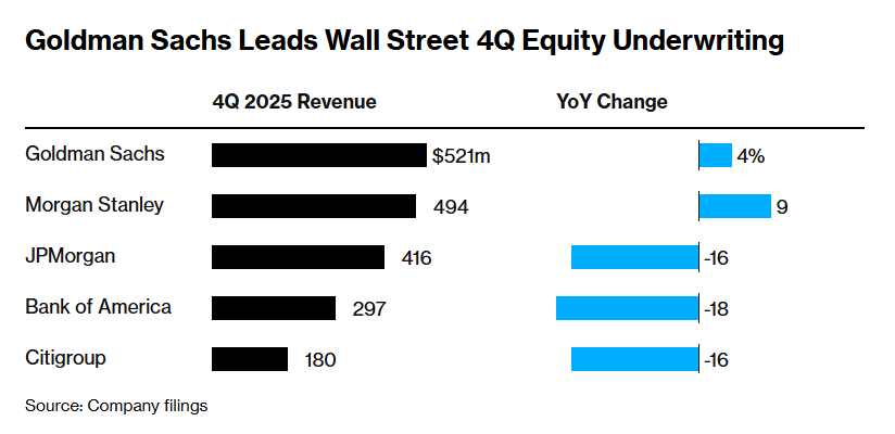 这家总部位于纽约的金融巨头报告称,2025年最后三个月,其股票承销性质的营收约为5.21亿美元,超越了摩根士丹利的4.94亿美元和摩根大通的4.16亿美元同项业务营收规模。